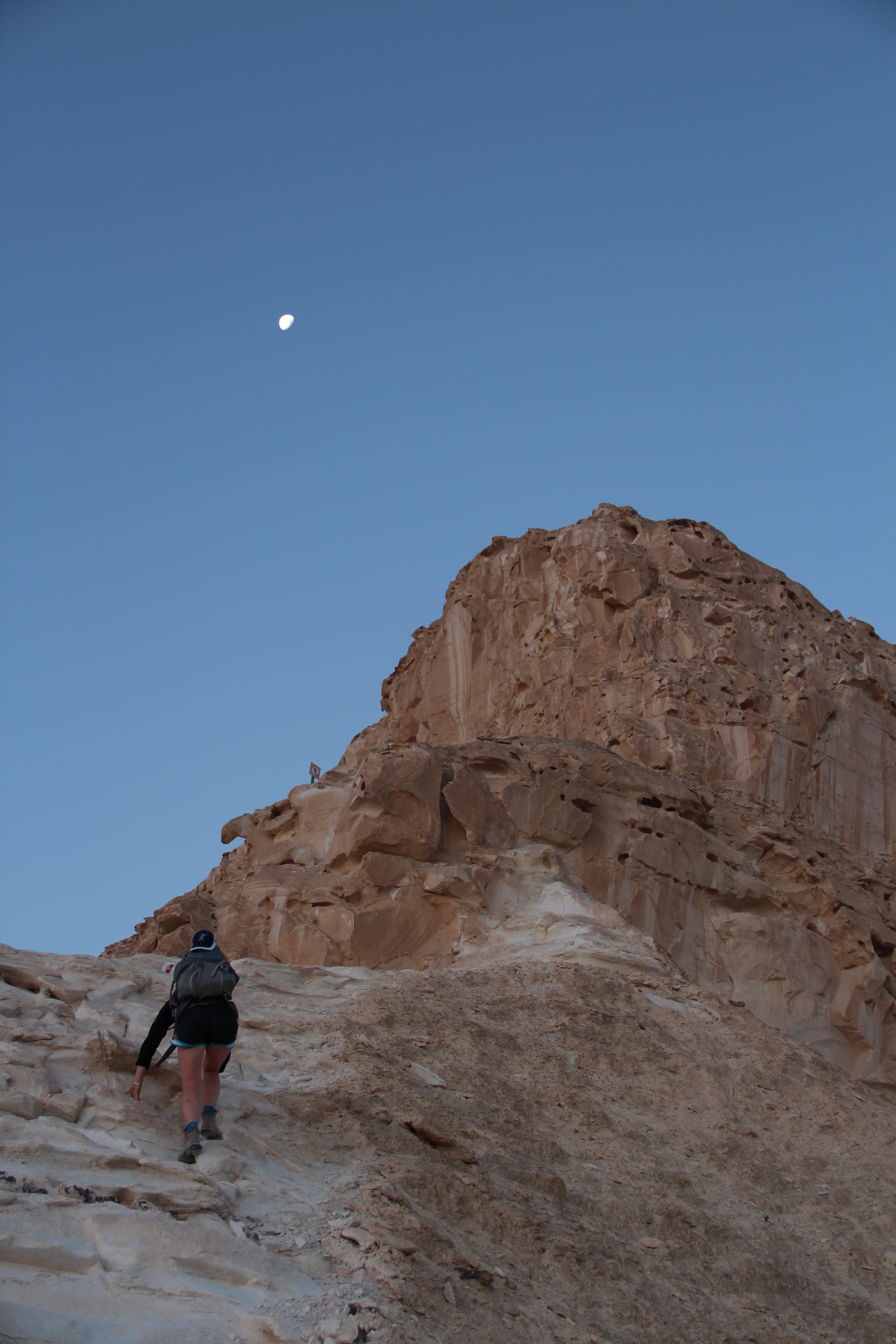 We woke up at 3:40 AM to find the world in a mist of fog, and curled back up inside the tent. At first light the fog burned off and we were packing our tent away. Eating an apricot, we walked down the Jeep track the 200 meters to the path. Cutting straight across the desert, no true trail, just red and white markers ever 100 meters or so, we made our way to the base of the mountain.