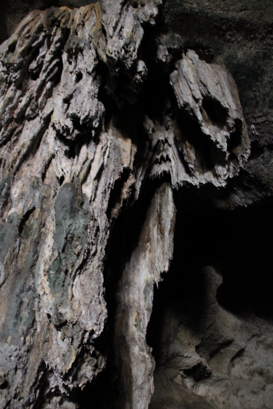 The further back you go, the more loudly you can hear the bat cries. The bats, themselves, hang from the ceiling with random bursts of movement and flight. The caves also have large stalagmite structures.
